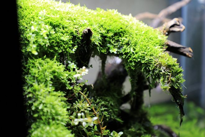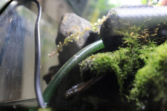 この水槽の一番の特徴は、ポンプで吸い上げた水が上から伝って下へ流れる仕組みになっていること。よく見ると、上流から下流に向かって滝のような水流があります。しかもポンプは1本だけ。「分水をしないで、石組みのすき間から水が回るようにしています。たまにこんな時、水のつなぎとしてコケを使うことはあります」。