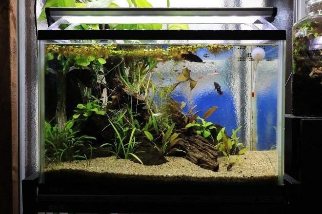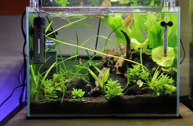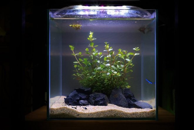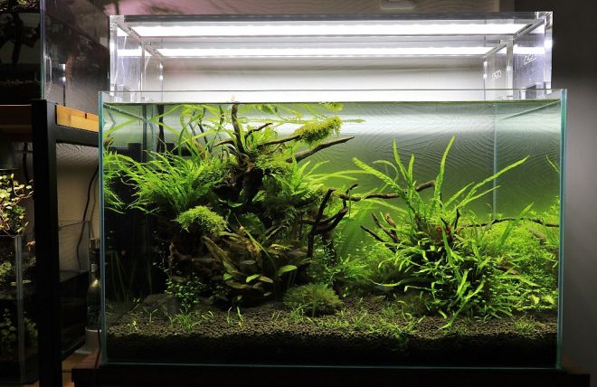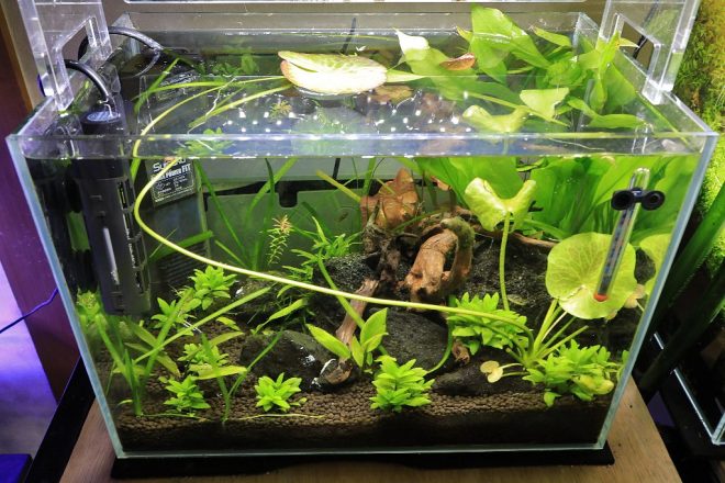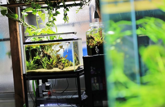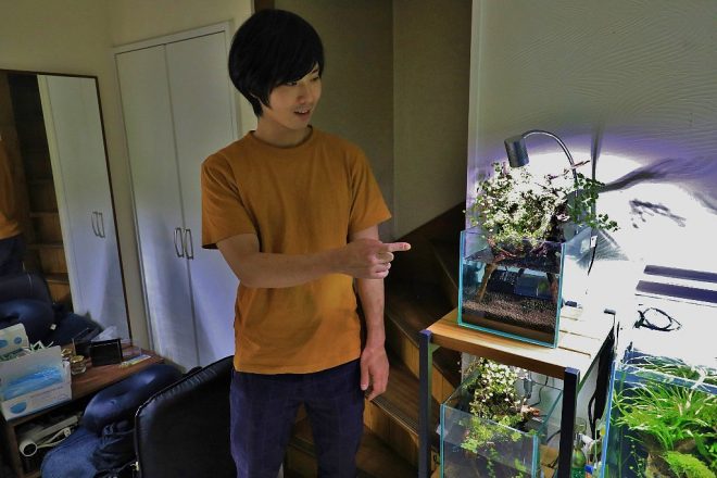 それではいくつかの水槽を紹介しながら、笹井君のこだわりを聞いていきましょう。これは2年前に製作した45㎝水槽。魚と植物が融合したアクアテラリウム。製作時から何度かのメンテナンスを経て現在の状態に。