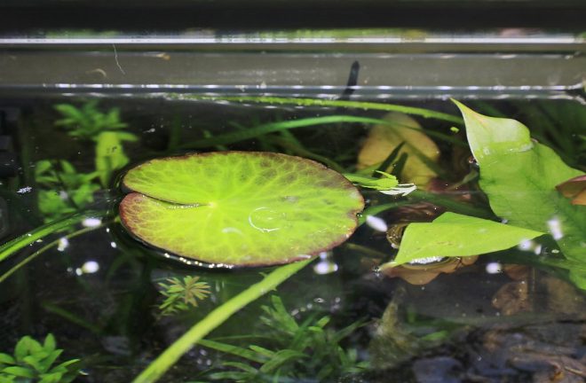 水上葉と水中葉がバランスよく使われています。特に、夏になると急成長する水上葉が愛しいのだとか。「条件が揃うと、予想しなかった花も咲かせてくれますからね」とうれしそう(笑)