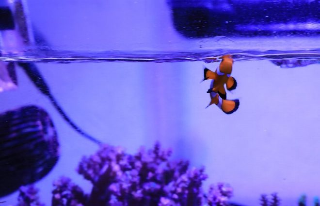 そんな環境下で、おなじみのクマノミやオレンジ色をしたおなかが印象的なルリヤッコが、水流に負けそうになりながら頑張って泳いでいます(笑)。「バクテリアバランスのために強い水流が必要ですが、給餌の時だけは流石に水流を止めるようにしています」。確かに自然の海では、水流はどこにでもあります。できるだけ自然に近いかたちで飼育するサンゴや海水魚。笹井君にとって、ある意味実験的な水槽だといえるでしょう。