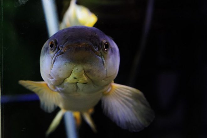 この魚も、エサを与えすぎるとダメ。エサを与えすぎてしまうと、何と死に至ることも。エサは1週間に2回で十分。さっきもそうでしたが、古代魚って案外人間に近いのかも(笑)。やっぱり人工のエサには脂質が多いから。「そういう点でいえば、KOTOBUKIのフライミックスは脂質の割合が少ないので魚の健康維持には絶対いいと思います。昆虫系を原材料に使ったエサはほかにもありますが、どれも脂質が多いんですよ」。体が大きくなるのはいいことですが、太るのは健康によくない。成分としての脂質は、魚も人間も気をつけなければなりません。