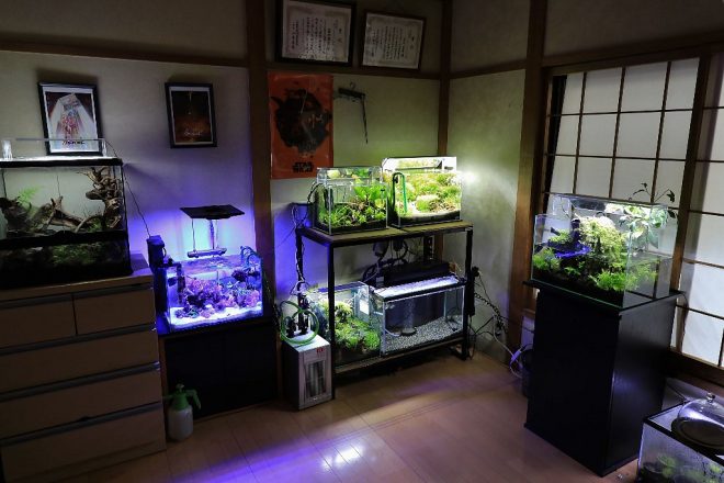 戸建て住宅3階の和室がヤバすぎます(笑)。壁に飾られた賞状やポスターや絵などは、もはや脇役。というか引き立て役。いくらガンバってアピールしても、もはや目に入るものは水槽しかなく(笑)。色々ウワサには聞いていましたが、これほどハイテンションだったとは思ってもみませんでした。