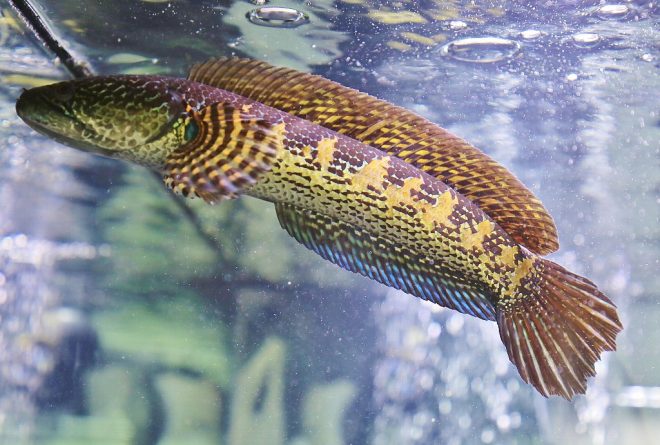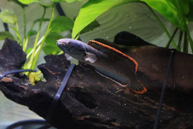 出ました!インドのアッサム産・バイオレットスネークヘッド。3階で見た古代魚もきれいでしたが、これまたきれいです。いかにもエキゾチックな色をしていますが、日本では比較的飼育しやすい品種だそう。