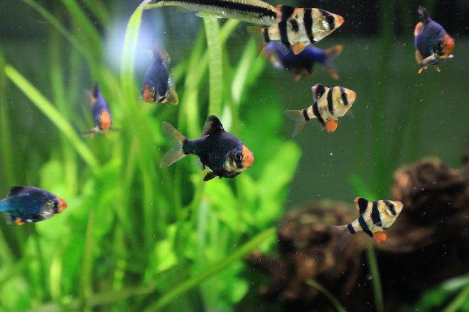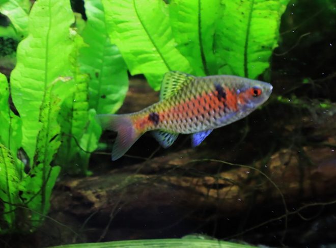 コイ科ばかりを集めた水槽。スマトラやグリーンスマトラ、トーピードバルブなどなど、確かに動きが速いし常にケンカを吹っかけるように誰かを追いかけ回しています(笑)。数あるほかの水槽は比較的のんびりした時間が流れているのに、ここだけは特別感満載(笑)