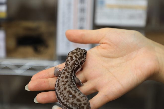 それでは早速女性スタッフお気に入りの子たちをご紹介。まずはニシアフのオレオパターンレス。オレオは、お菓子のオレオに似た黒(もしくは茶色)に白のバンドが入りますが、こちらは名前の通りパターンレスなので模様がないタイプ。ニシアフはつぶらな瞳とぽってりとした尻尾が特徴で、2年ほど前からレオパ同様人気が高まってきました。レオパに比べると、やや地味なカラーではありますが色柄のパターンがたくさんあって、かなり奥が深い感じです。