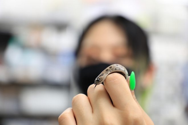 そしてスタッフも基本女性が対応。とっても親切でやさしいみどりこさん。「顔はボカしておいてくださいね」。ハイハイ(笑)。ヘビが大好きでこの道に入ったという変態です(笑)。彼女が手にしているのは、セイブシシバナヘビ。独特な頭の形状がかわいい。なので女性にも人気があるのだそうです。そういえば、数年前にユーザー訪問で取材したレプ女のおうちにも、この子と同じヘビがいたことを思い出しました。
