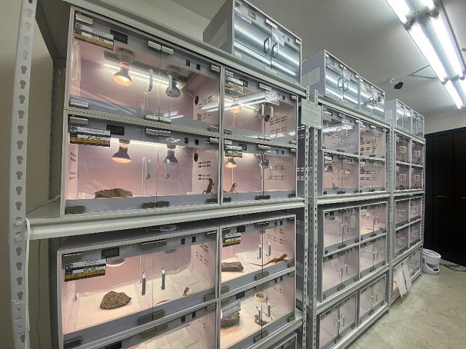メンテが行き届いた個別の飼育ケージ。決して取材があるからと、大慌てで掃除したわけではありません。「毎日いつもと変わらぬ状況です」とクールなS店長。夜行性のニシアフたちもとっても快適そう。爬虫類だからとおそるおそるケージを覗き込まないといけないダークな空気は、ここにはありません。