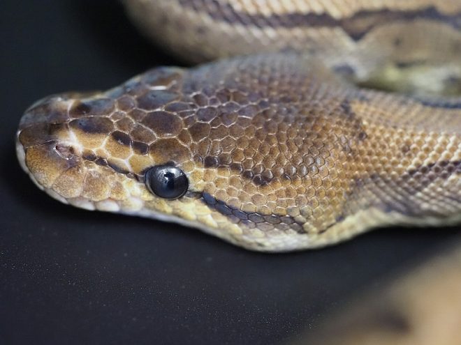 続いてみどりこさんお気に入りのヘビなんか少し。さきほどみどりこさんとのツーショットを紹介したシシバナは小型タイプでしたが、ヘビといえばやっぱりこれ、ボールパイソン。これはちょっと珍しいVPIアザンティックパイボールで、真っ白な部分と模様のある部分とか交互に組み合わさっています。おなかのほうも白くてきれい。黒色の色素を持たないアルビノに比べて、アザンティックは黄色の色素を持っていません。ボールパイソンも、血統によってはさまざまな特徴があるみたいです。