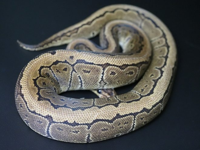 パターンレスposshetオレオゴースト。オレオでしかも全体にモヤっとした脱皮前のような色合いになるオレオゴーストの遺伝子を持っている可能性があるので、繁殖させた時どんな個体が出るのかが楽しみなのだそう。オレオは掛け合わせによってさまざまな体色や模様が期待できるので、繁殖をメインに飼育する人には人気があります。