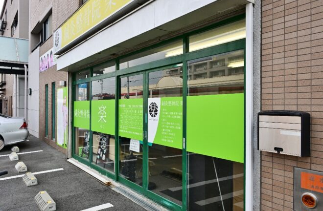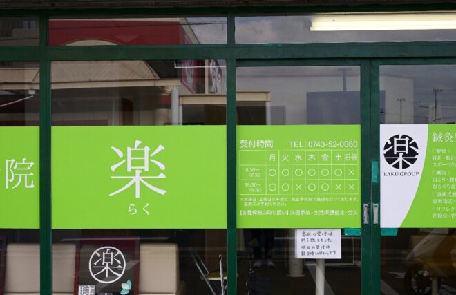大和郡山市内ではありますが、どちらかというと奈良市に近いほぼ北端。幹線道路に面した一角に、鍼灸整骨院 楽(らく)がありました。