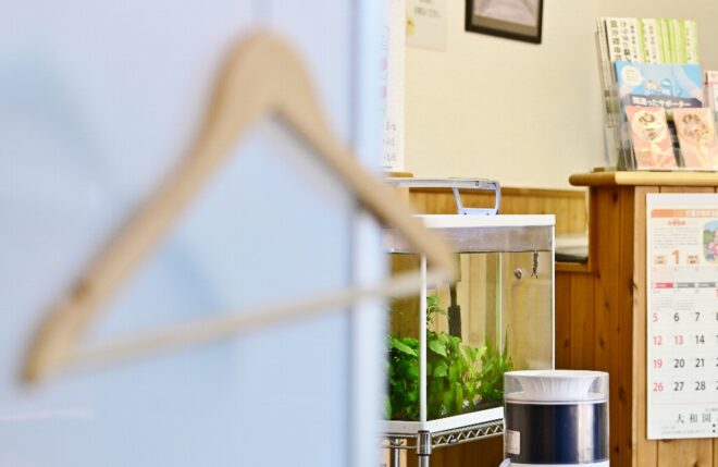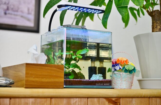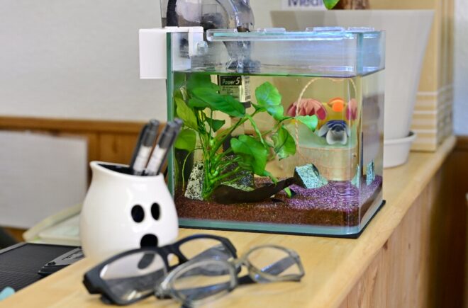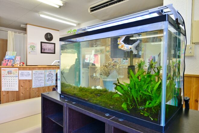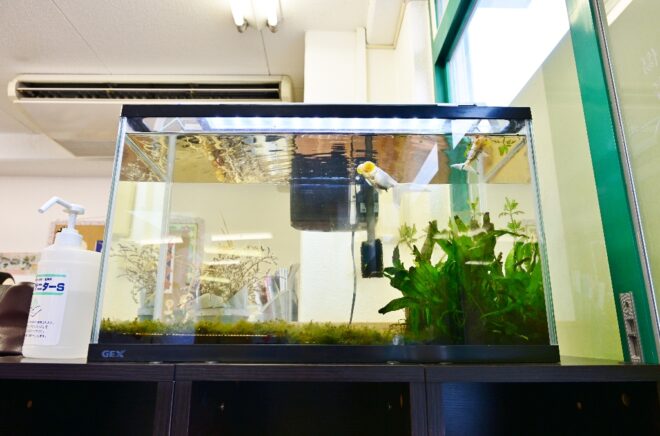受付のところにも水槽があります。こぢんまりとした20㎝キューブが、限られたカウンタースペースによく似合っています。