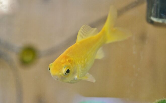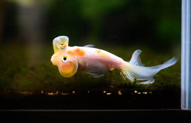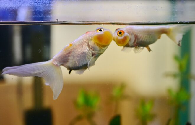 入口に近い水槽にいる水泡眼はいつも仲良し。平和ですよね~。当初のコンセプト通り、入れ替わりこそはありますが今も金魚がメインです。