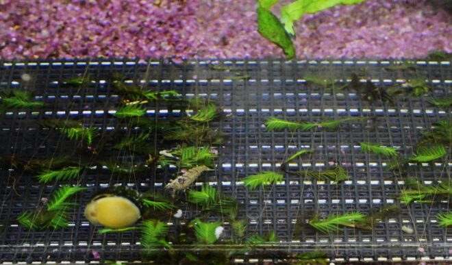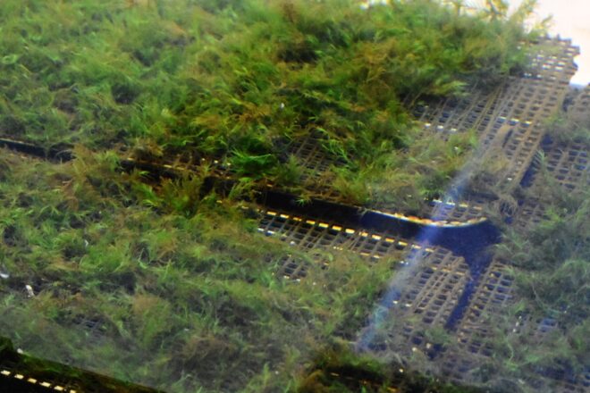2段ある水槽の上段にもウォーターフェザー。こちらはきれいに色づいてますね。「でももっと密集させないとね(笑)」。