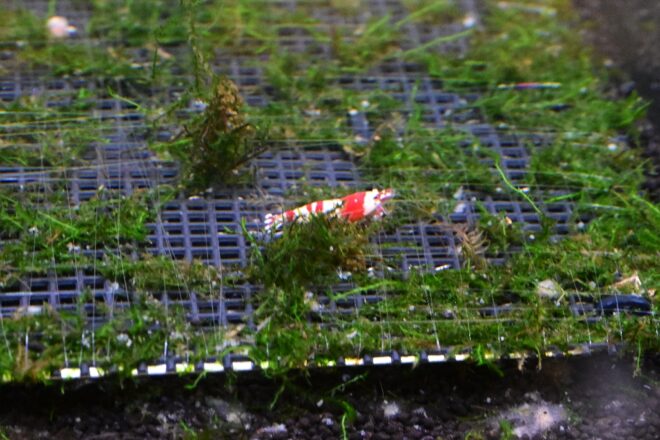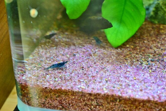 目を凝らしてみると、きれいなベルベットブルーシュリンプが数匹わさわさ。ソイルなどのアクセサリーとのカラーカーディネイトもイケてます。