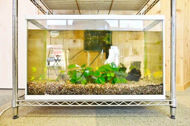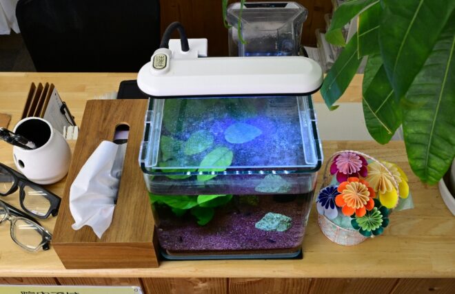 もうひとつ水槽がありました、オフィスに30㎝キューブ。ここにもエビがいるんですが、もしかしたらエビを増やしていきたい感じ?「まだ実験段階ではありますが、そうなればうれしいなと思ってます」。おお~、エビユーザー増えてほしいです。