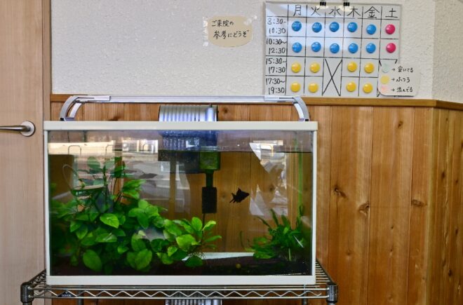 魚の数そのものはさほど多くはありませんが、アクアな待合室は確実に患者さんたちの癒しにひと役買っています。