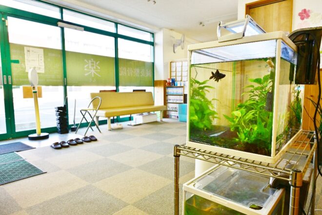 「大和郡山といえばやっぱり金魚でしょ!」。当然っちゃあ当然の成り行きで、開業後すぐに水槽を待合室に置いた奈良県大和郡山市の鍼灸整骨院 楽(らく)院長・橋本和孝さん。当初は1本でスタートしたアクアライフでしたが、生きもの好きな患者さんたちの後押しもあって次第にバージョンアップ。施術を待つ待合室で、アクアとともに寄り添う患者さんたちとのアットホームな空気が毎日流れています。