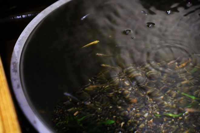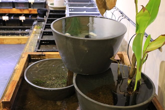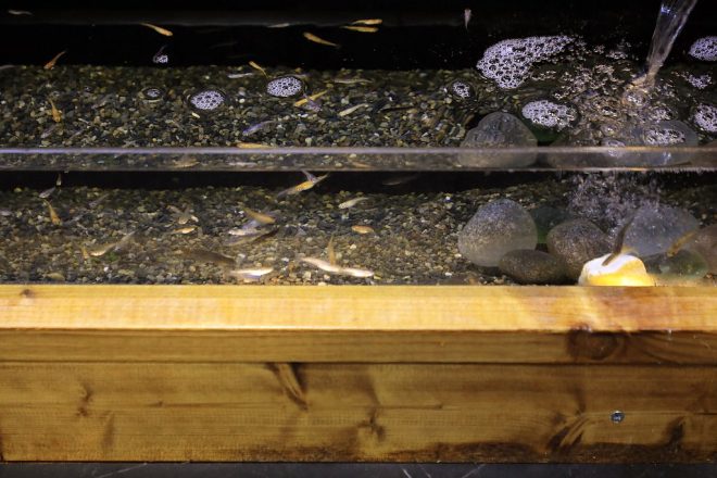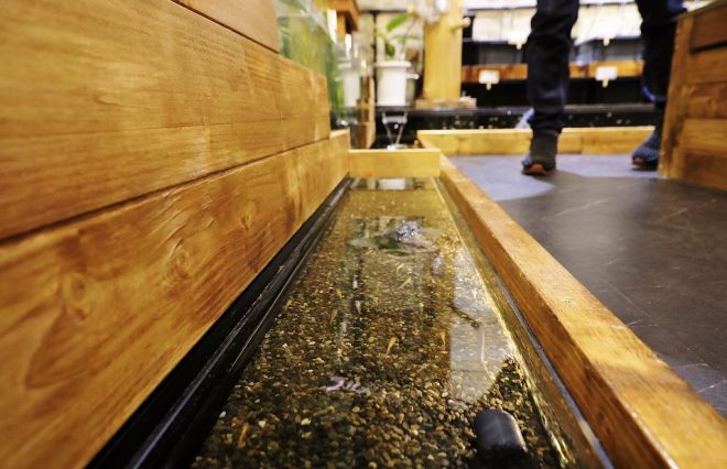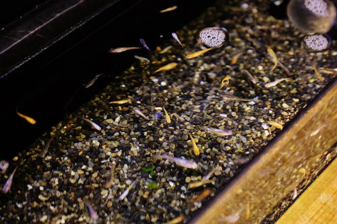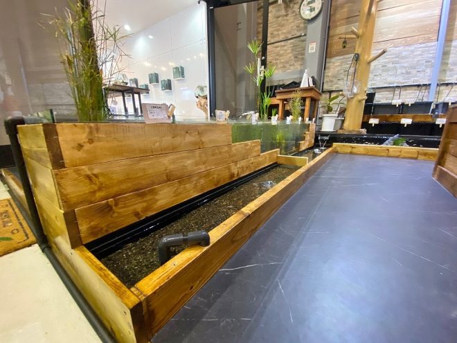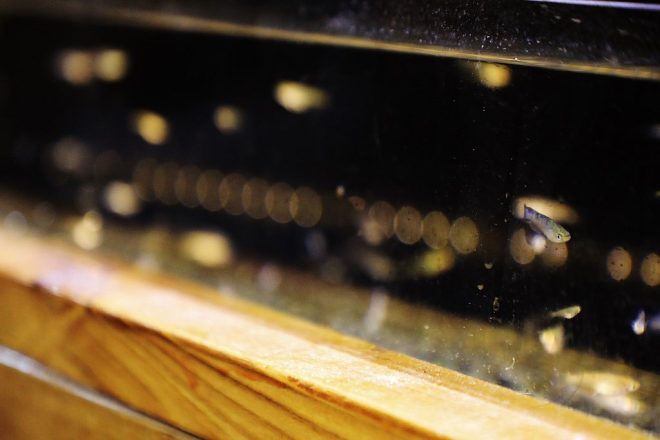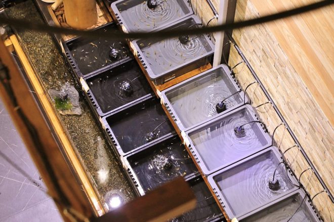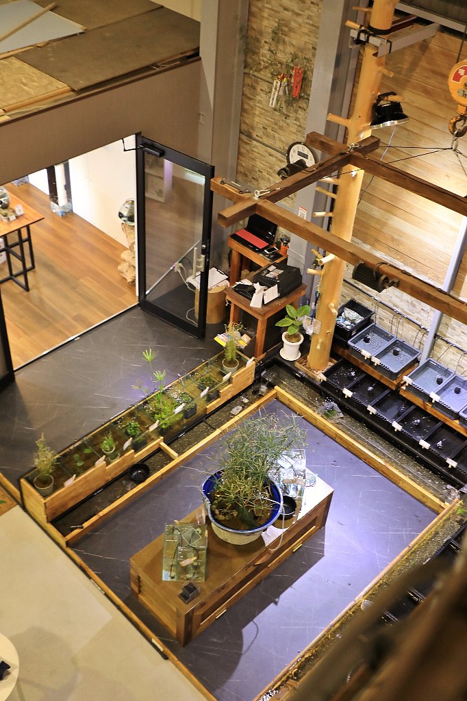 スタイリッシュな白を貴重にしたメダカリウムのスペースに比べて、星龍川はどちらかというと木のぬくもりを感じさせる和テイスト。大東市の養殖場で余剰となったパレットで基礎をつくり、ベースとなるアクリル水槽を別注し、水が自然に流れるように段差をこしらえ、木の質感を大事にした化粧板を随所にかましてフィニッシュワーク。手先の器用なスタッフの大宅秀仁さんとの共同作業により、プロジェクト完了。そのほとんどがハンドメイドというから驚きです。