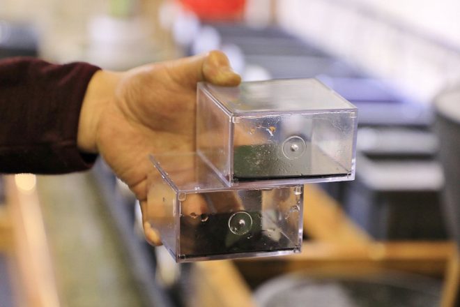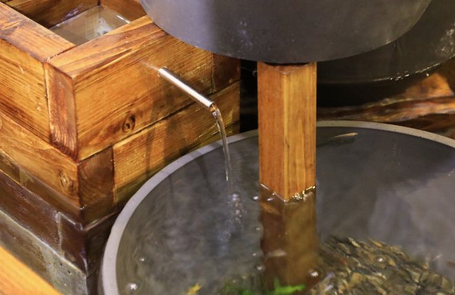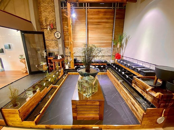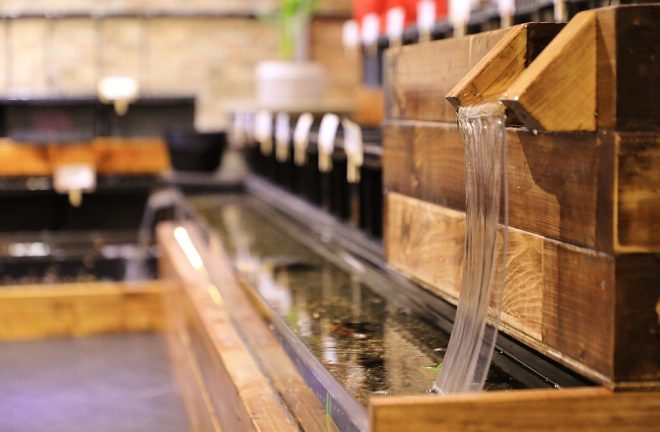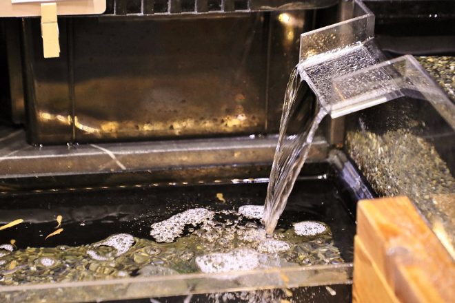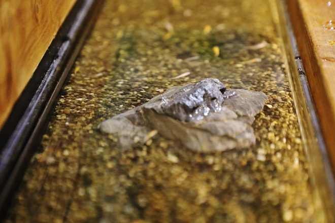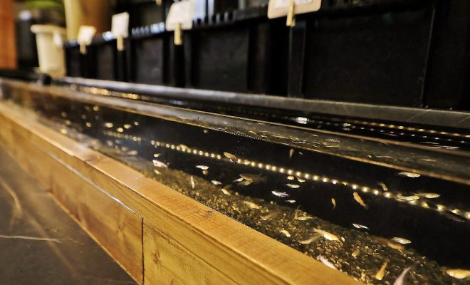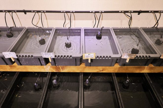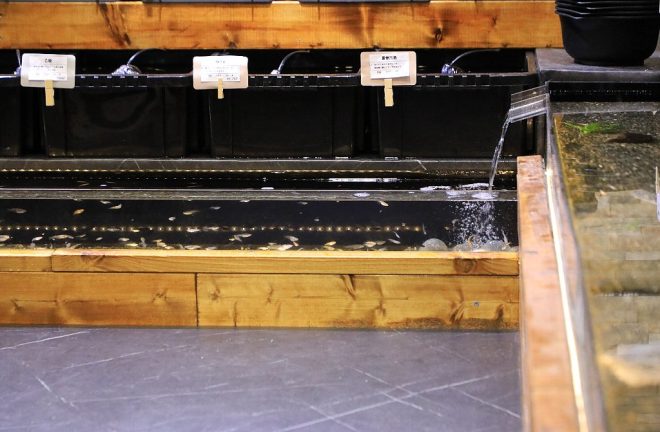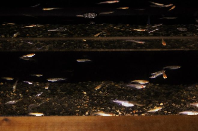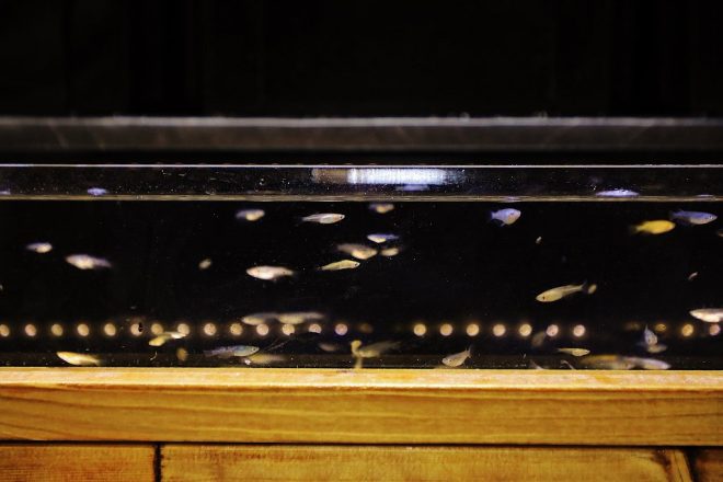 スタイリッシュな白を貴重にしたメダカリウムのスペースに比べて、星龍川はどちらかというと木のぬくもりを感じさせる和テイスト。大東市の養殖場で余剰となったパレットで基礎をつくり、ベースとなるアクリル水槽を別注し、水が自然に流れるように段差をこしらえ、木の質感を大事にした化粧板を随所にかましてフィニッシュワーク。手先の器用なスタッフの大宅秀仁さんとの共同作業により、プロジェクト完了。そのほとんどがハンドメイドというから驚きです。