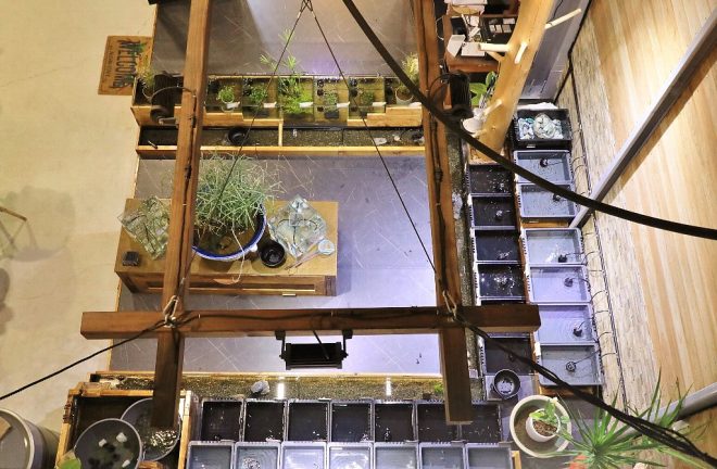 「星龍目髙」は、工場倉庫を利用したユニークな店構えのメダカショップ。といっても生体販売がメインではなく、水槽やメダカ鉢などを巧みに使ってメダカの見せ方を提案するのがウリでした。