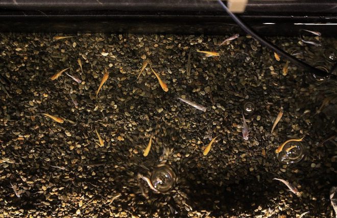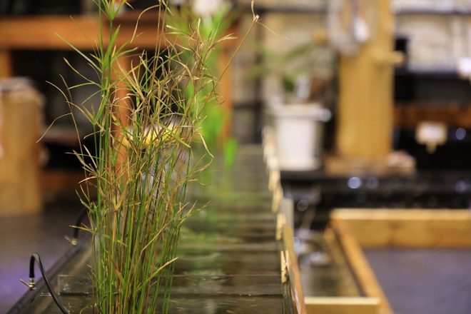 川の全長は約6m。幅は約30㎝。今まで体験したことのない水の空間で、メダカたちが心地よさそうに泳いでいます。まさに水を得た魚。上見でもなく横見でもなく。この日のために選ばれたメダカにとっての新しいセッションは、間違いなく「川見」です。