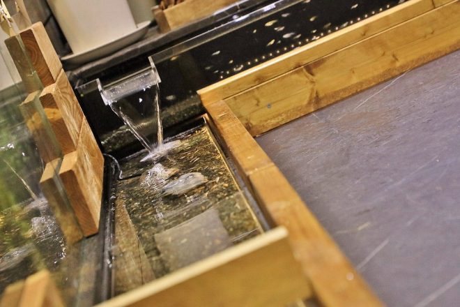 上流の小滝。落差約20㎝。勢いよく水が流れ落ちてメダカが驚かないように、絶妙な曲線を描いたアクリル板に沿って、水がやさしく川に注ぎ込まれていきます。