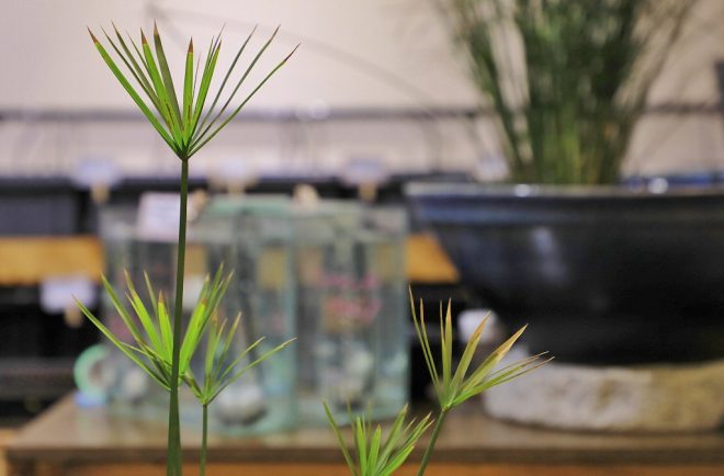 下流近くのほとりには、いくつもの緑とうるおいもあります。シラサギカヤツリやミニシペラス、グリーンロタラ、ウォーターバコパなどなど、どれもビオトープには欠かせないものばかりです。