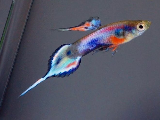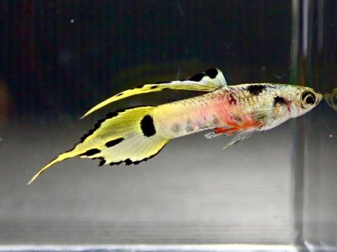 「長い歴史の中で、グッピーはデルタテール以外にもさまざまなかたちの尾ビレのタイプが作出されてきました。スピアテールやピンテールなどとといわれる品種がそうです」