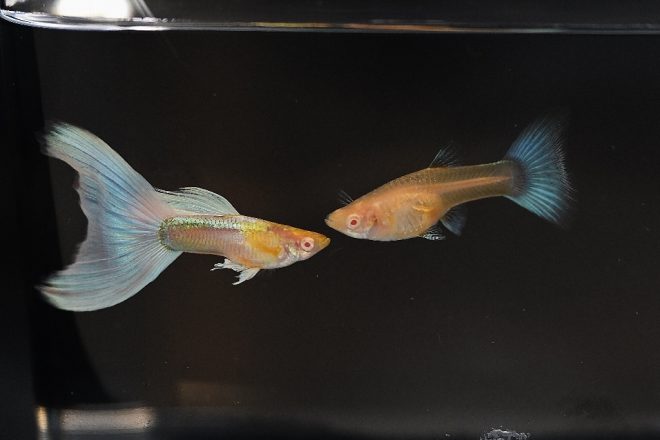 ある意味、好みが分かれる2タイプの尾ビレのグッピー。ソード系のグッピーはまだまだ認知度の低い品種ですが、海外ではどちらも作出がさかんです。芹内さんたちブリーダーの努力の甲斐あって少しずつ認知度も高まっています(※写真はスリースポット スピアテール)。