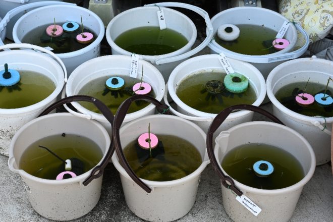 ちなみに水槽に貼られた丸いシールは、毎日給餌を任された奥様用。シールのある水槽とない水槽とでは、エサの種類が違うのだそうです。