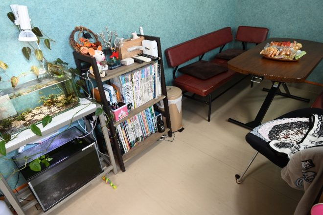 これは!ドアを開けたらすぐに水槽がズラリと並んでいるのかと思いきや、芹内さんここは一体?「カフェ部屋です(笑)」。カ、カ、カフェ?なるほど、リビング家具やTV、雑誌などが置かれた素敵すぎるくつろぎスペース。今日はここでじっくり話を伺いますから覚悟しといてくださいね(笑)。