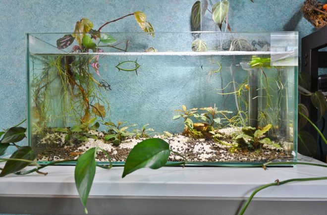 反対側のスチールラックやスチール台には、パルダリウムやグッピーの成魚、熱帯植物など計9本の水槽が置かれています。