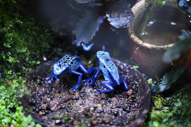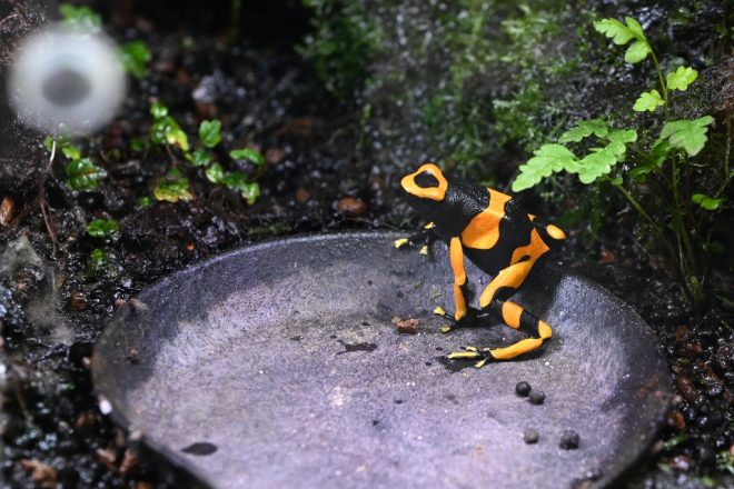 パルダリウム水槽にはエキゾチックなカラーのヤドクガエルが数匹。エサをやると、奥のジャングルからゴソゴソと出てきてムシャムシャ。うまいのぉ~、って言ってそう。