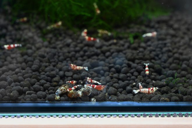 いよいよ温室の核心部分へ。何と美しい!アクア特有のにおいも一切ありません。そして4段に仕分けられた木製水槽棚に圧倒されます。一番上の段にはグッピーの成魚や幼魚など計15本、2段目にはグッピー以外にもビーシュリンプもいる水槽が14本、3段目にはグッピーの成魚以外にパルダリウム水槽など計12本、そして4段目にはビーシュリンプ、水草など計6本の水槽が置かれています。