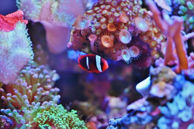 海水の水槽では、幼魚体のまま大きくなったハマクマノミやスズメダイが泳いでいます。