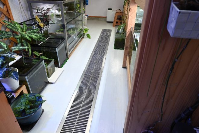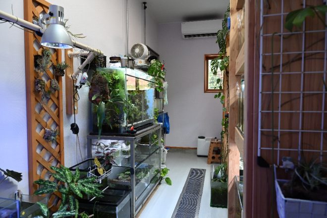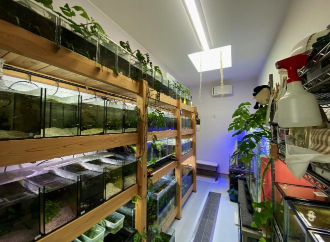 特に温度管理。温室ならエアコンで一括管理ができるものの、芹内さんに言わせれば「温度管理がしやすい広さってあるんですよ。温室の定義は一定の温度を保つことができる部屋と考えているので、それに見合った水槽数とスペースでないと意味がないんですよ」。かくして、「自宅水槽ゼロ計画」は成功したのです。