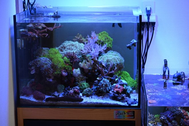 唯一、オーバーフロー式の海水水槽が2本加わり、彩りを添えています。魚の内訳を聞いただけでも、グッピー中心だということがよくわかります。