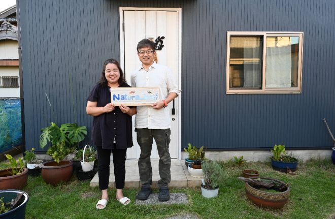 温室のエントランスで奥様の幸江さんと。さて次回は、自慢のグッピーを一挙ご紹介。お楽しみに。
