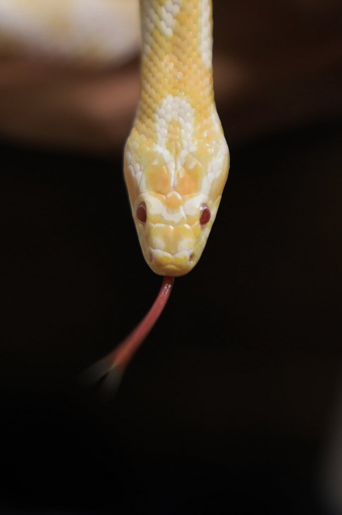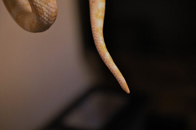ん?ヘビにしては尻尾が短くない?「以前実家にいた時にネコに噛まれてしまったんです」。えー、ネコちゃんに負けちゃった(笑)?動物病院に行った唯一の生体だそうで、残念ながら尻尾はうまく再生できずに今も少し短い感じでした。長生きしてね、コーン君。
