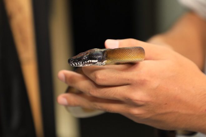 飼育に関してのSHINYA君のポリシーは、「できるだけ自然に近い環境で育てていきたい」という点。ああ、野性的に飼いたいというのはそういう意味も含まれていましたか。今回見せてもらったヘビはどれも活発だったのも、温度管理など自然に近い環境で育てられているからこそ。ちなみに、このコロンビアレインボーボアは比較的おとなしかった気がしました。