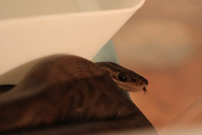 一方このコーンスネークは、ここでは一番の古顔。飼育を始めてからすでに13年が経過しています。もしかして、コーンスネークが好き?「はい、特にスノーと呼ばれる種類のものが好きです」。アオダイショウ同様、こちらもよく活発に動いています。