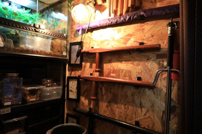 一人暮らしをしているSHINYA君の部屋には、水槽とともに数々の武道具がずらり。これが一体何なのかわかる人は少ないはず。でもキワメテスタッフならわかります。想像できないでしょうが、キワメテスタッフも若いころはブイブイいわしてた空手家だったんです!