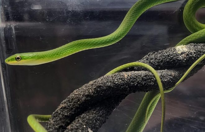 ラフグリーンスネーク。もちろんこの子も活発で元気です。臆病な性格で、飼育が難しく、半年以上飼えるといいほうだといわれているほどの上級者向き。飼育が難しいということは、やっぱりエサが左右する?「もともと消化器が弱く消化不良を起こしやすいヘビが意外と多いんです。消化しきれないと、お腹の中で腐ってしまい命の危険性だってあります。そうならないためにも、うちではどの子に対してもエサは少なめに心がけています」。ヘビは消化不良を起こしやすい。そして、消化不良が不健康の原因になりかねない。これは本当に意外でした。