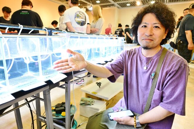 開場早々、売約済みとなったことでゴキゲンのmunmun shrimpさん。「エビは癒されますよ。自分好みのえびをつくれるところが楽しいです」。聞くと、3カ月程度の早い周期で作出できる点も手軽に飼育できるメリットだとか。