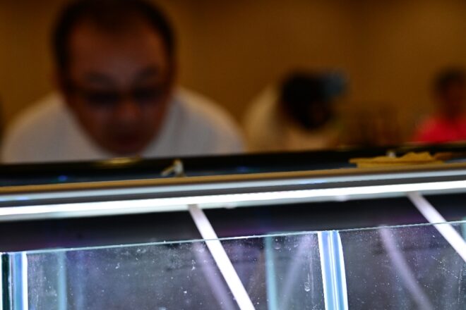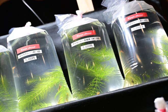 それぞれの水槽には、ペアのエビがワサワサと可愛く遊泳。表示されているのはペア価格。あのツマツマした行動もじっくり見れます。全国から集まったトップブリーダーたちの成果がこんなに身近に見られるなんて、なんちゅう贅沢。