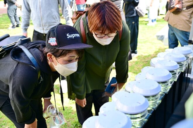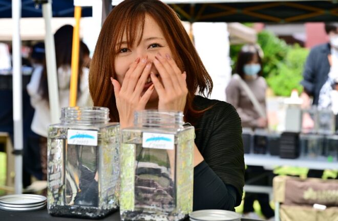 そこへやってきた2人のお客さん。女性同士で香川からお越しのメダカユーザーなのだそう。「以前からSNSでチェックしていたので、奈良まで足を運んだ甲斐がありました!」。この日は、香川で帰りを待つ友人に誕生日のプレゼントとして、別のブースで「アルビノを買いました!」。おお、誕プレにもメダカが貢献しているとは、今時の女子はお目が高い。