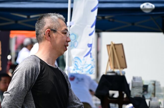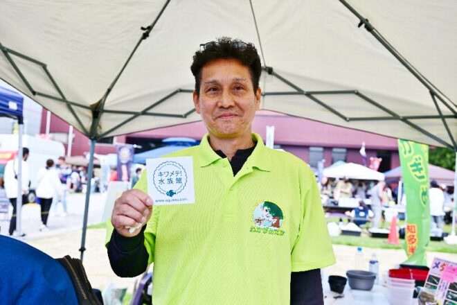 いかにも奈良らしい屋号を掲げた飛鳥めだかさん。とっても温厚で、テントを立てるのも邪魔くさいからと汗をたらたら。このかた、実はすごい人なんです。