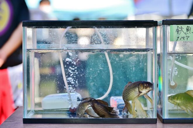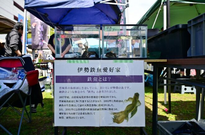 彩さんを復旧のために奮い立たせたのは、何といっても鉄魚。一見金魚のようで金魚ではない、その名の通り渋い鉄色が特徴です。しかも絶滅危惧種。決して泳ぎがうまくない鉄魚ですが、尾びれを優雅にひらひらさせて舞う姿は一見の価値あり。稀少な鉄魚を目の当たりにして、足を止める来場者も少なくありませんでした。