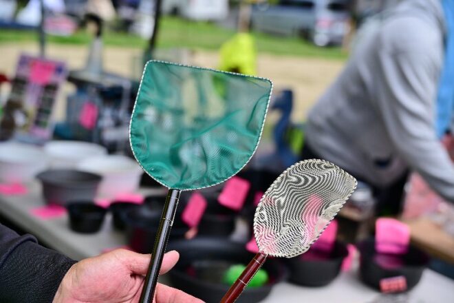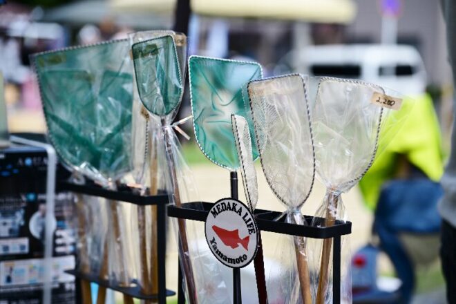 飼育中のメダカをすくうのに欠かせないタモ。素人から見ると一見普通の網に見えますが、独特の製法があるらしく、メダカ愛好家のテンション維持に貢献しているのだとか。茂さんと同じ愛知から出品中のわかぎめだかさんのブースにもタモが。タモって、ただのアクア用品ではないんですね。