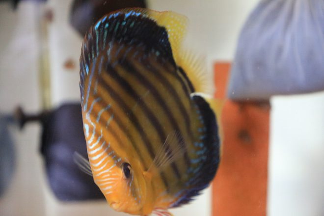 先日の台風のような大雨が降ったり長雨が続いた時は、川の水質が変化するそうです。このため、上水道の浄水場を経由した水であっても、水質はさほど変わらないとのこと。「決まって魚の調子が悪くなるんです。体の色が普段より黒くなるのですぐにわかります」と。人間にとって恵みの雨であっても、ディスカスにとってはあまりよくないのかも知れません。佐藤君の経験則ではありますが、みなさんもぜひ注意してくださいとのことでした。